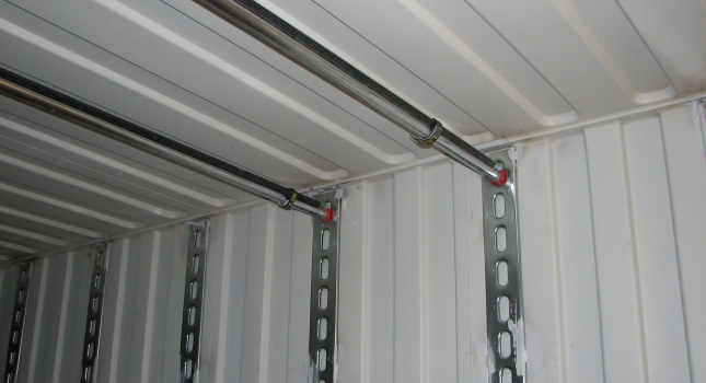 The garment container is perfectly suited for transporting hanging garments. The garment bars used for yhe hanging garments can easily be removed or moved up to the ceiling of the container. This way the container can be used for traditional transport of 33 euro pallets without losing loading space for pallets, thus reducing the need for empty backhauls.