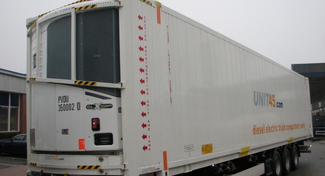 A fin de ofrecer a sus clientes posibilidades adicionales de generación de ingresos, UNIT45 también ha elaborado una versión especial de su contenedor frigorífico diésel-eléctrico: un contenedor frigorífico de triple compartimento. Capaz de transportar simultáneamente 3 productos totalmente diferentes, tales como pescado fresco y congelado y flores, el contenedor cuenta con dos paredes móviles Frigo que se puede asegurar en diferentes posiciones de acuerdo con la división de la carga. Uno o más evaporadores adicionales permiten 2/3 temperaturas diferentes en los diferentes compartimentos. Esta capacidad de carga parcial permite que el operador de transporte traslade cargas de 3 transportistas diferentes, pero se espera que en la mayoría de las aplicaciones los clientes del operador de transporte usen un solo contenedor para transportar dos o más mercancías, por ejemplo pollo fresco y congelado, al mismo tiempo.