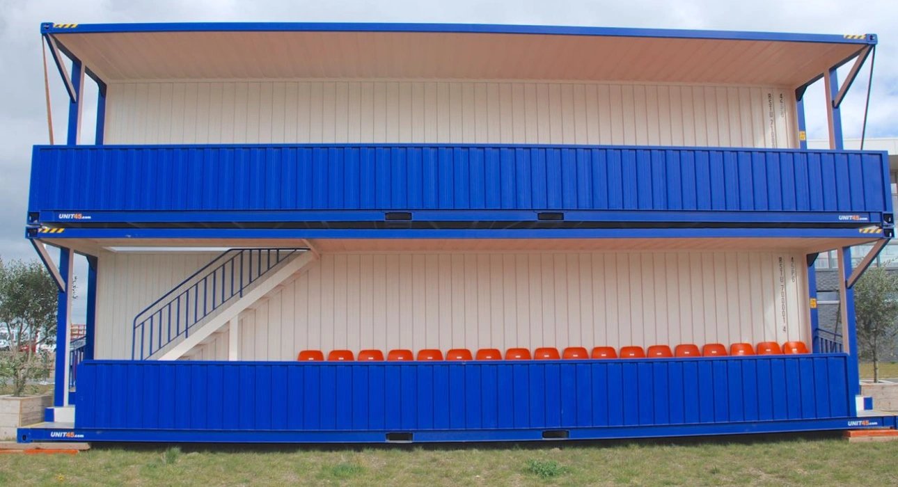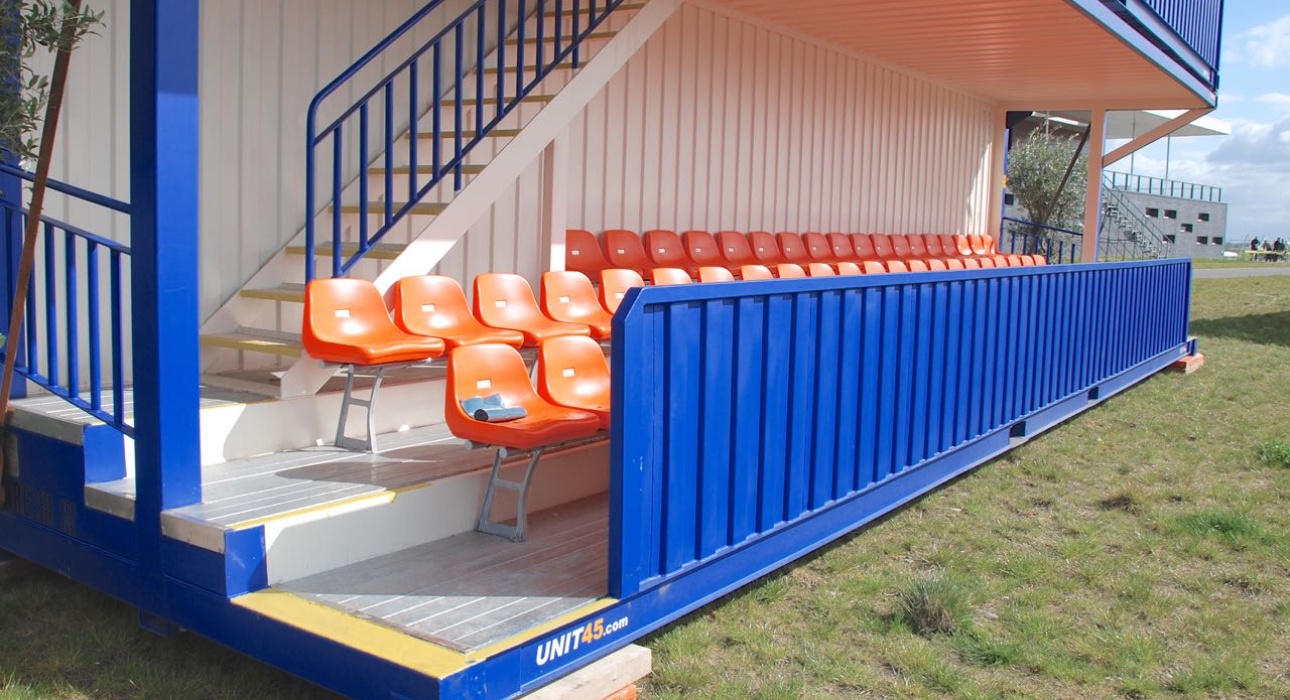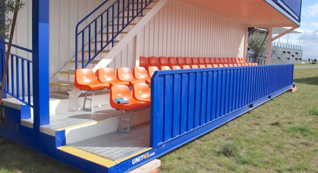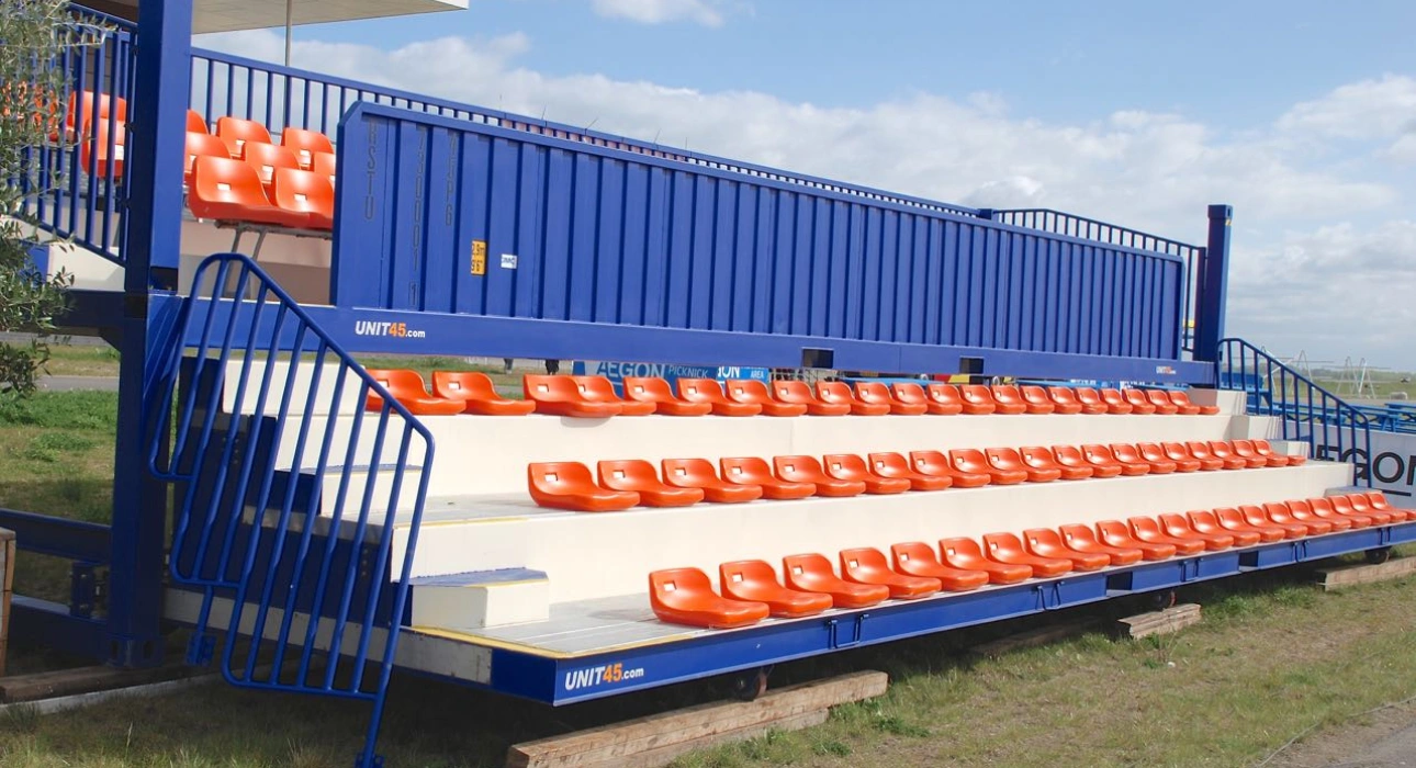 UNIT45 heeft een modulair tribune systeem ontwikkeld dat past binnen de container infrastructuur. De basis tribune container van 40ft beschikt over 66 overdekte zitplaatsen en is modulair uit te breiden zowel in lengte als in hoogte. Dit laatste kan wel tot drie niveaus hoog binnen de bestaande footprint van de eerste laag. Dit geeft ongekende mogelijkheden voor de creatie van een compleet stadion!